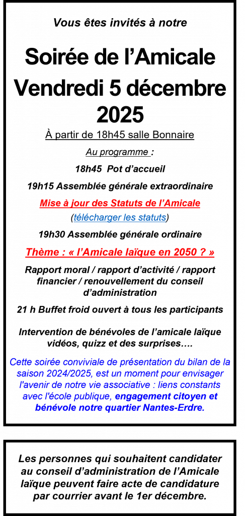 Pour les 70 ans de l’amicale, la chorale des Marsauderies organise une soirée concert avec la participation des enfants de l’école des Marsauderies, la chorale de Port Boyer, la chorale de l’ALPAC (Alpachoeur), du groupe de Djembé de l’amicale de Longchamp et bien entendu la chorale des Marsauderies. Au cours de la soirée, il y […]