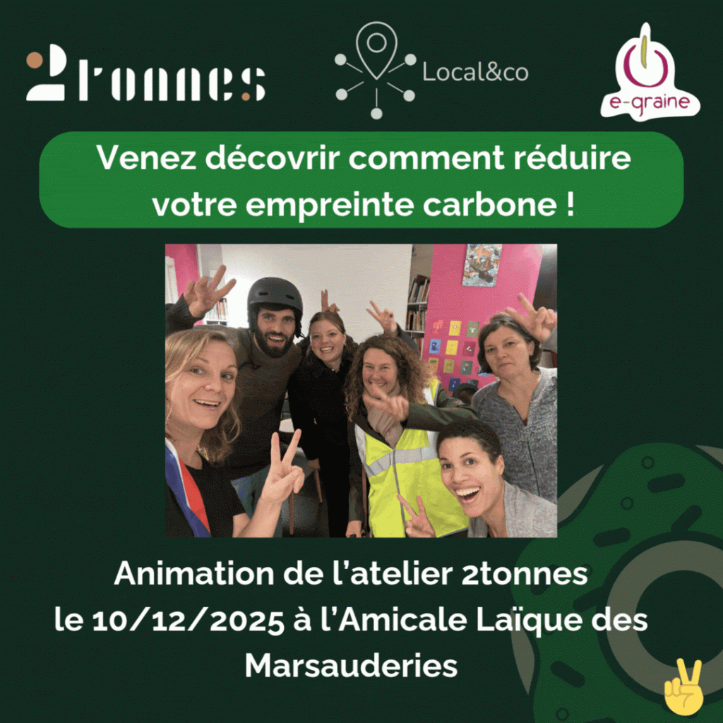 Mercredi 10 décembre à 19h – Salle d’activités de l’Amicale laïque des Marsauderies – Participation sur inscription Après la Fresque des frontières planétaires, qui a eu lieu au mois d’octobre, l’Amicale vous propose un nouvel atelier ludique pour passer à l’action : l’atelier 2tonnes. L’atelier 2tonnes est un serious game qui vous emmène jusqu’en 2050 afin […]
