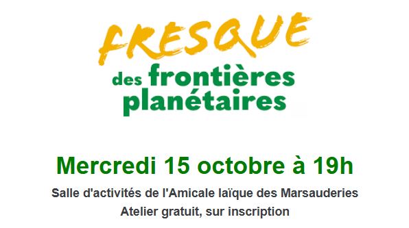 Mercredi 15 octobre à 19h Salle d’activités de l’Amicale laïque des Marsauderies – Atelier gratuit, sur inscription Le cycle de fresques, que vous propose l’amicale pour la troisième année, démarre le 15 octobre avec la fresque des frontières planétaire. C’est la fresque la plus complète sur les enjeux écologiques : outre le climat, on y […]