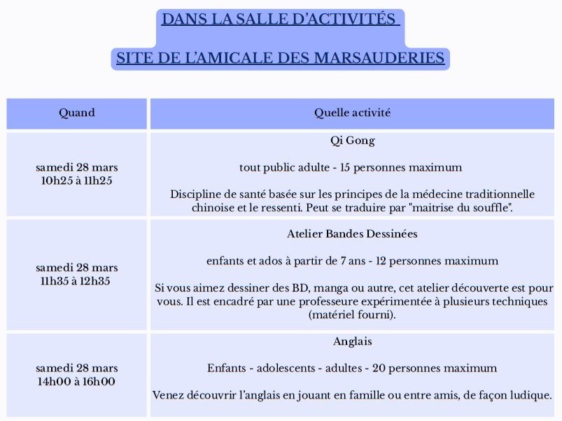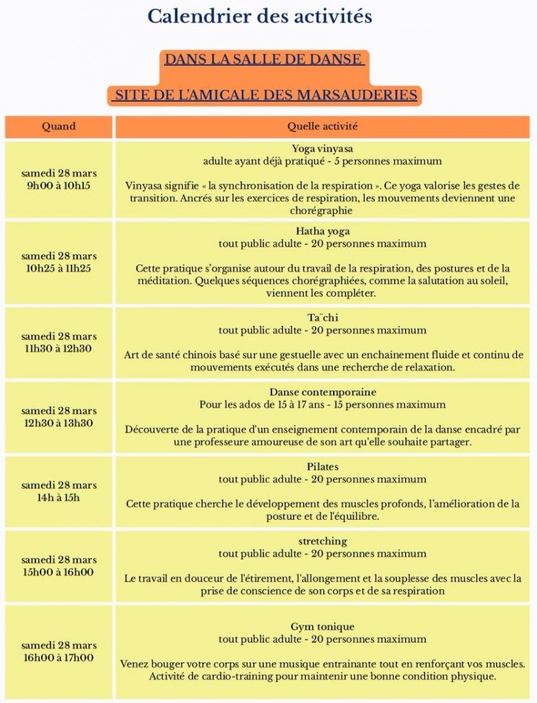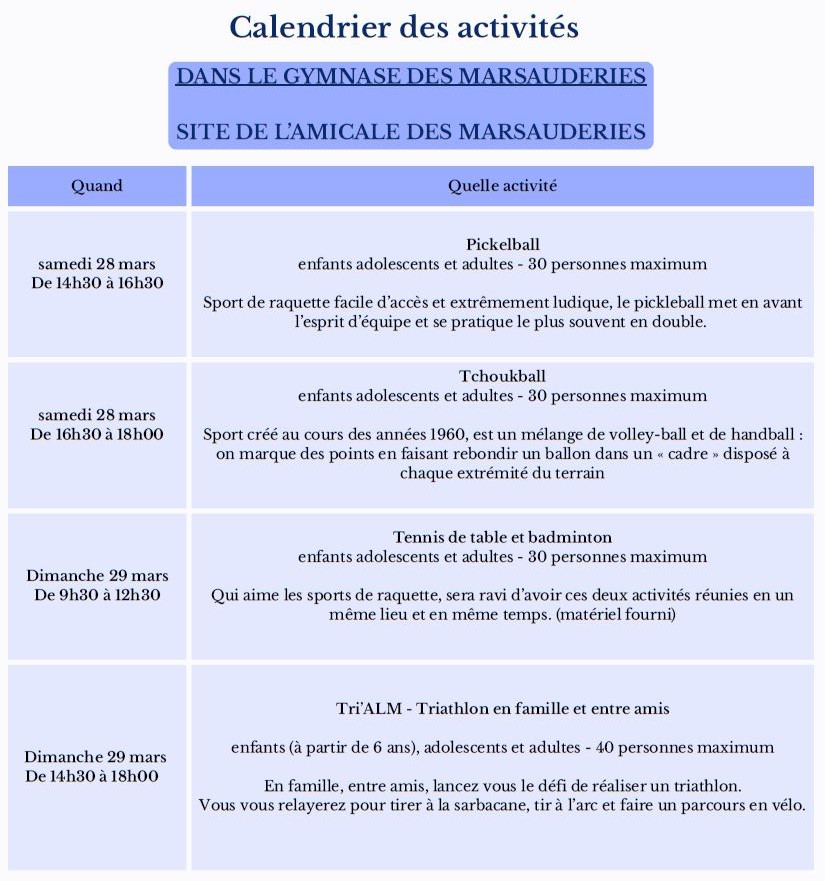 L’Amicale laïque des Marsauderies organise un week-end sportif et culturel du vendredi 27 au dimanche 29 mars 2026.